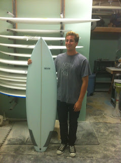 this is a shortboard i did for max it is 5'10" 18.5" 2.25" it is really similar to the one i did for kane just below its just a little fuller in the rails and wider.....so yea just read the board descrition below its like the same....he got the custom glass ons one pink and two cheetah/black fins. then he went for the carbon front foot patch....it looks a little kookie and also super sick at the sametime but it really does make a big difference...i highly recommend an additional something should be added to lightly glassed boards on the front and rear fin. he loves this thing too...i surfed with kane the other day the guy below and max but kane is super super pumped on his well and it really enjoyed watching him surf that things he was ripping soo hard...gotta love when someone is not only pumped on a board you built them but when they absolutely rip the thing too.
